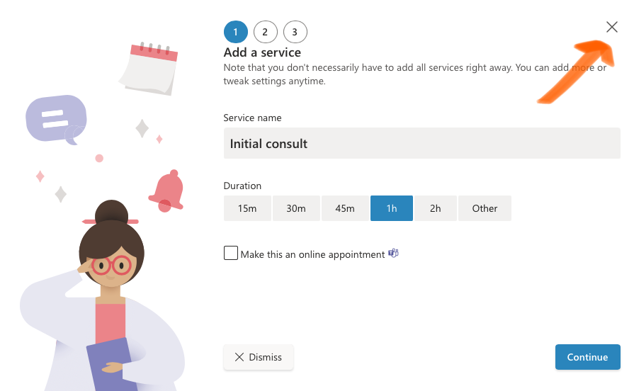 When you add your first service, Bookings does not actually give you all the options you truly have—they’re trying to make it seem simple in this initial walkthrough, I guess, but I just find this irritating. I recommend closing out of it.